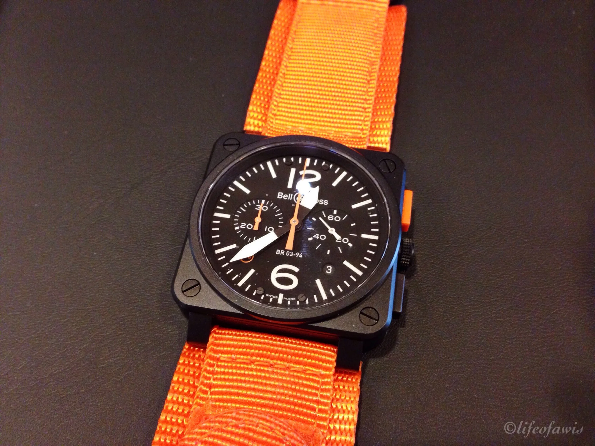 This Limited Edition 03-94 Carbon Orange is easily one of my favorite watches from their Baselworld 2014 releases just because of the black and orange combination. The new orange canvas strap is one of those things that Bell & Ross fans, myself included, have been asking for some time now (more colors of the canvas straps and rubber straps please!). A few subtle differences compared to the 03-94 Carbon remind you that this piece is limited to 500 pieces: orange chronograph hands, orange push button, and their trademark LTD mark in orange as well. Unfortunately, the case is still stainless steel with a PVD treatment... although Bell & Ross did release several 03s with their all new black matte ceramic cases this year.